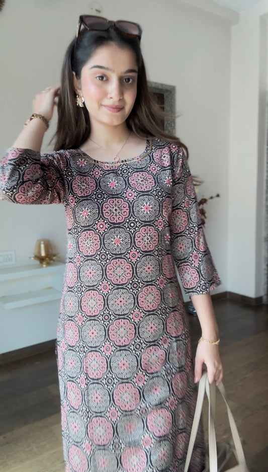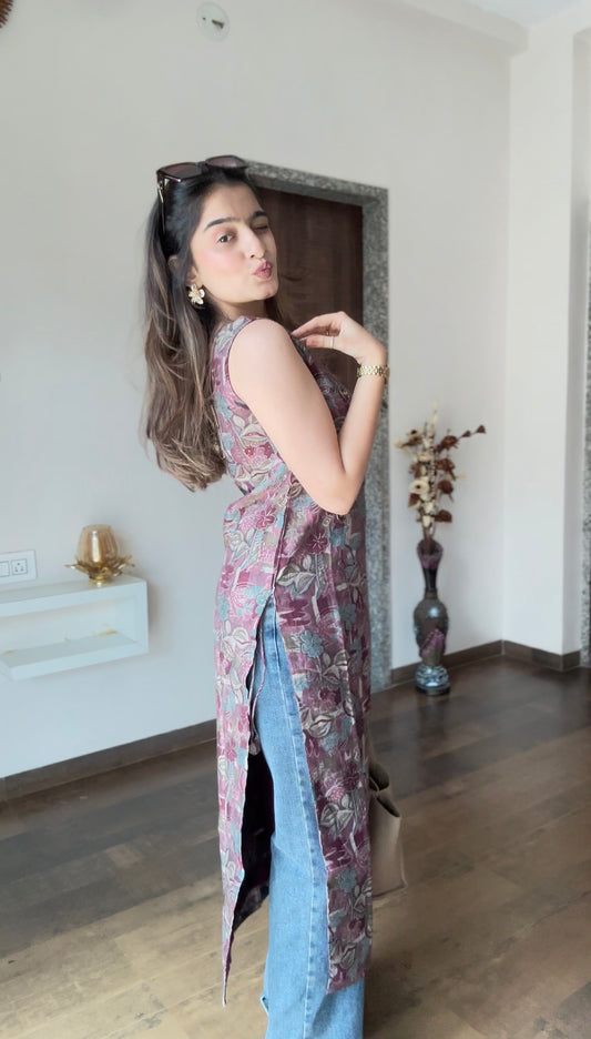 Grape Wine Multi Printed Gazi Silk Kurti