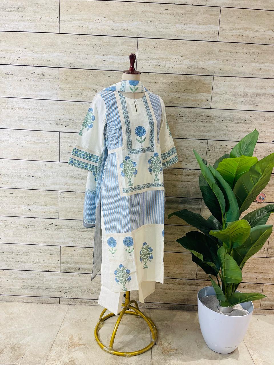 - Blue rose handblock printed pure cotton dupatta set
